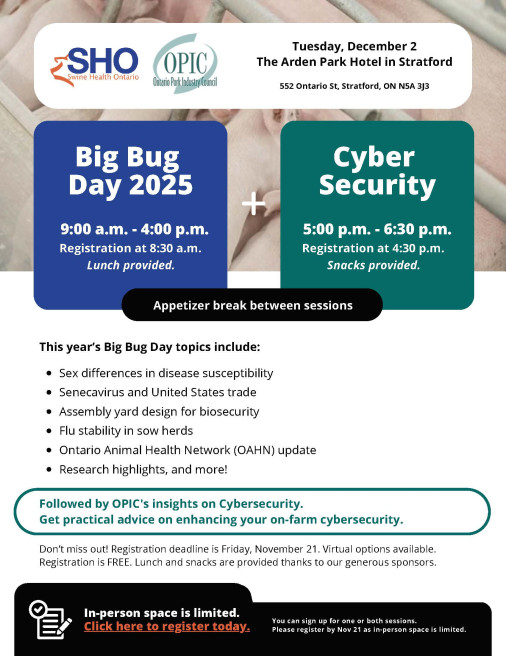 Swine Health Ontario (SHO) will be hosting Big Bug Day December 2th, 2024 at the Best Western Arden Park in Stratford, ON. SHO is committed to continuous improvement in swine health management through a proactive, practical and responsive programs that collaboratively engage the entire swine industry.